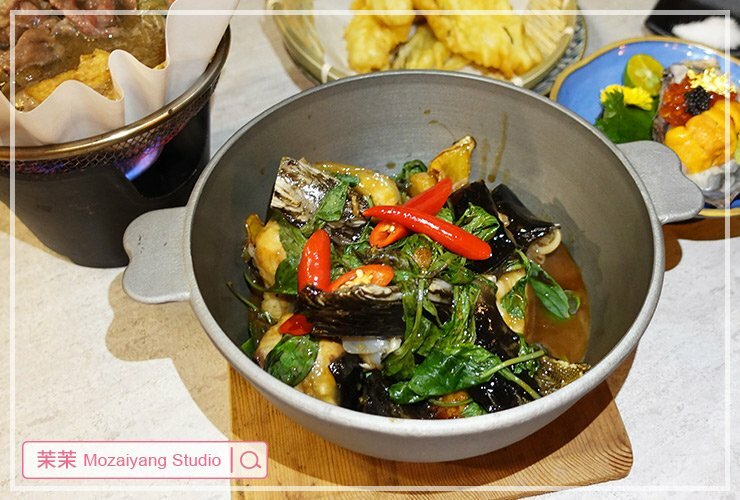 鱘龍魚是膠質很厚的魚,這鍋用三杯的作法,塔香十足,一上桌就令人食指大動。