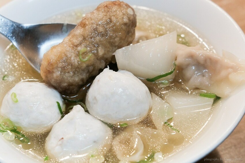 點一碗綜合湯,裡頭的料滿滿,餛飩、雞捲、魚丸、菜頭都有。可是不能加湯…,有點可惜,因為湯真的蠻鮮甜好喝,有點關東煮湯的感覺。平常在台南、嘉義去小吃店用餐,幾乎每一間店都會給加湯,但是這邊一碗 $60 元不是很便宜,不給加湯,我是覺得有這麼一點小氣。