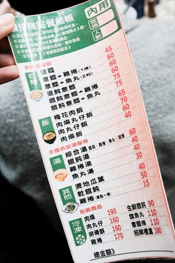 嵐肉燥專賣店的菜單有寫了幾樣注意事項,像是不能外食,湯品不提供加湯服務。當天用餐時,我們隔壁桌不過有人拿個小吃起來吃,就真的有被阻止,所以大家還是尊重一下店家,不然店員阻止你他也是尷尬。菜單除了肉燥飯外,還有意麵類、湯類跟青菜等等。如果想要買伴手禮,有冷凍的包裝商品,像是肉燥、肉丸仔、排骨酥、雞捲…等。要送人的話,更可以直接買一盒招牌禮盒喔。