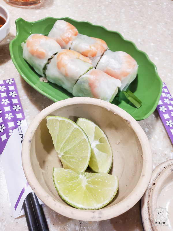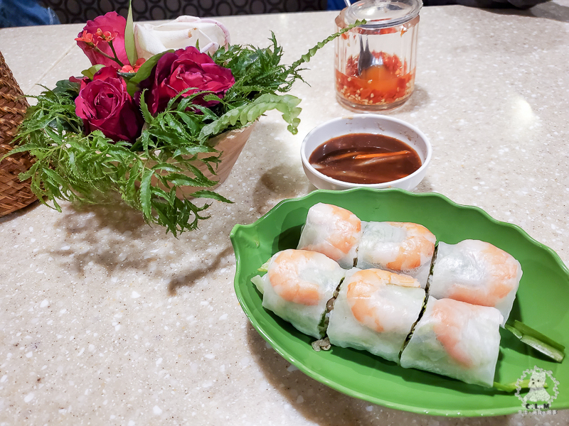 他們家的生春捲不太便宜,兩捲就要價90,但是很好吃,那白裡透出光澤的外皮實在有夠Q,裡頭有隻完整的蝦仁,沾上濃郁又鮮美的特調醬汁,讓人很快就把一捲給吃得光光。