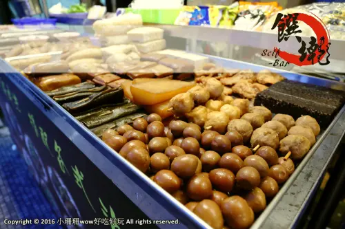 攤位前面的玻璃櫃有琳琅滿目的小菜盤