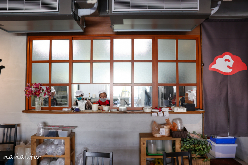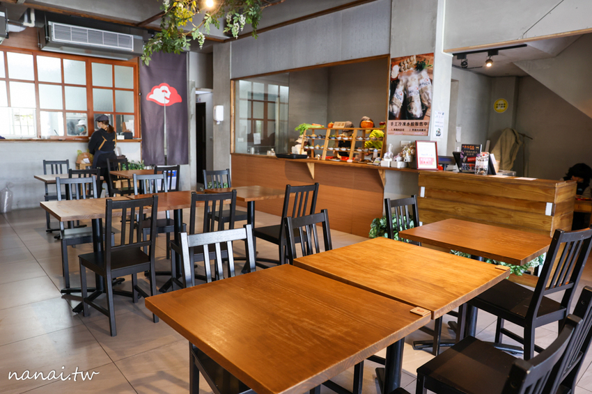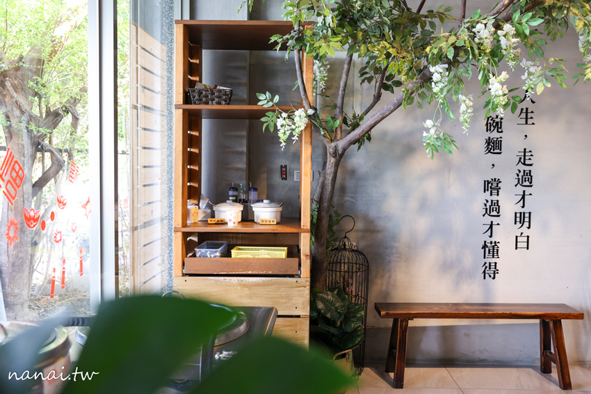 灰白色系水泥牆,妝點著木色系桌椅、吧檯、綠葉植栽,製餐區還特別用透明木窗設計,整體沒有傳統麵店那種油膩感,而是乾淨寬敞又舒服的用餐空間。