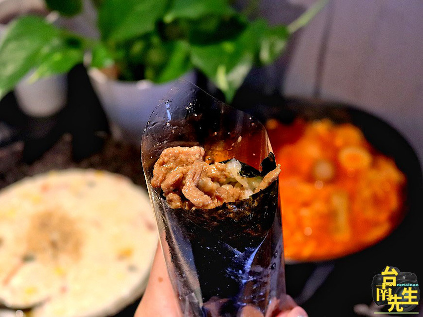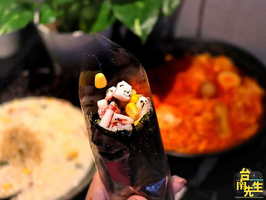 鮮嫩海魷(限量):魷魚實際包入海苔裡會切成小塊狀,比較方便入口,沒有多餘調味,入口鮮美彈牙,吃得到海魷的鮮甜滋味(照片是特別把食材放在開口處,方便拍照呈現,實際出餐都是包在海苔裡面喔)