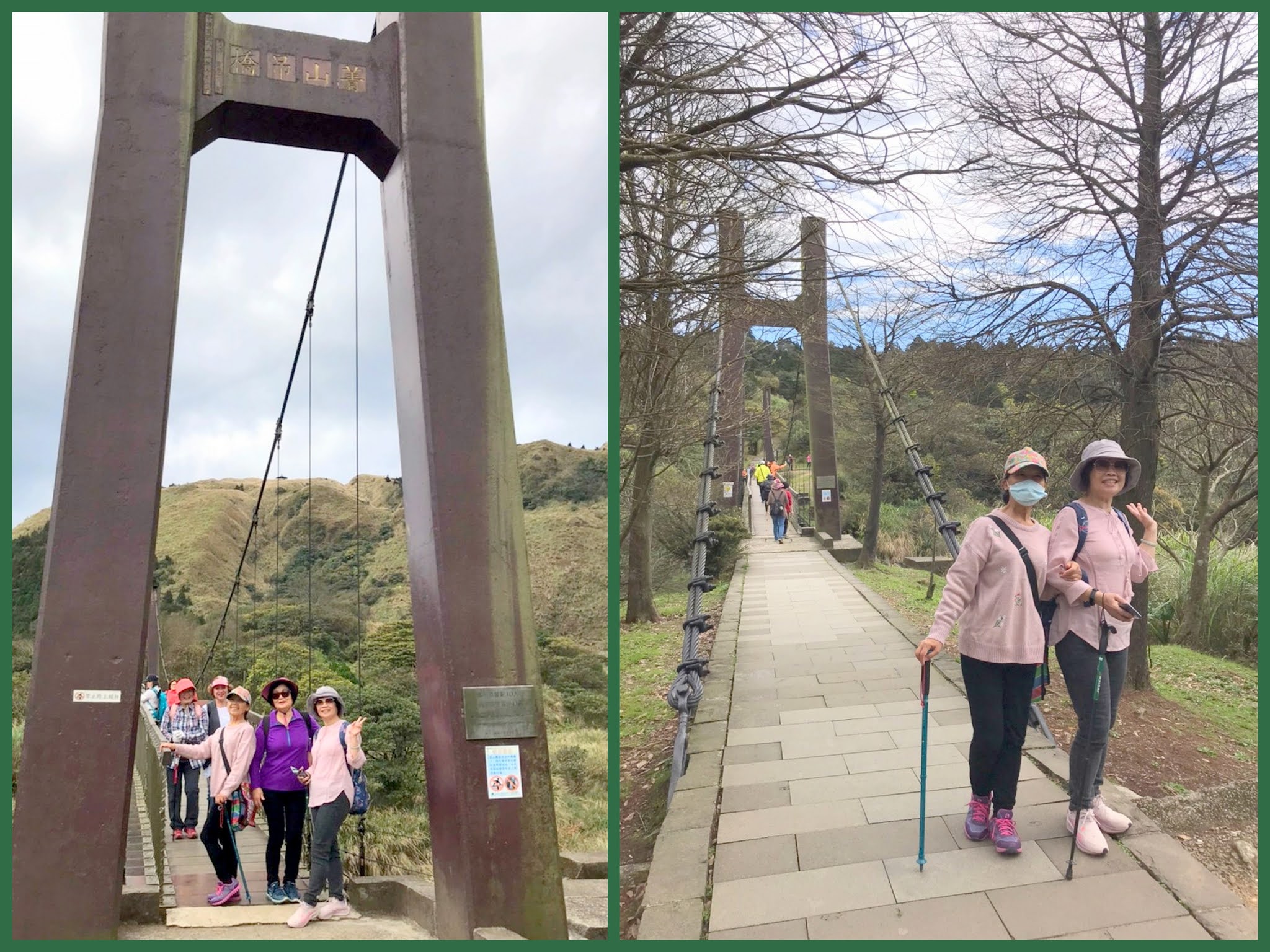看步道兩旁蒼翠的樹草,和菁山吊橋橋下溪石及瀑布的