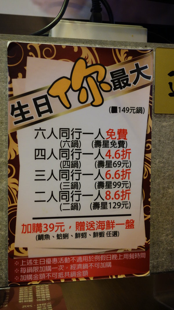 餐廳門口掛著每天不同鍋品的優惠活動,要去用餐的朋友們可以注意一下,可以省一下荷包,當個精打細算聰明的消費者吧!