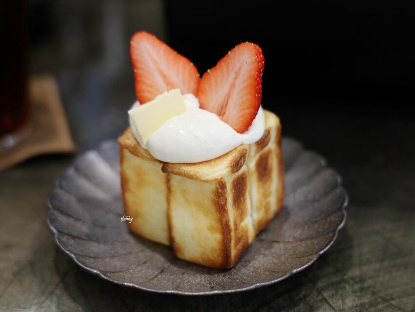 將吐司切成小方塊,塗上奶油進烤箱烤,之後淋上奶油起司醬,並加上一片有鹽起司片,最後飾以草莓,感覺有點像是有著紅色耳朵的小兔子,超可愛的!