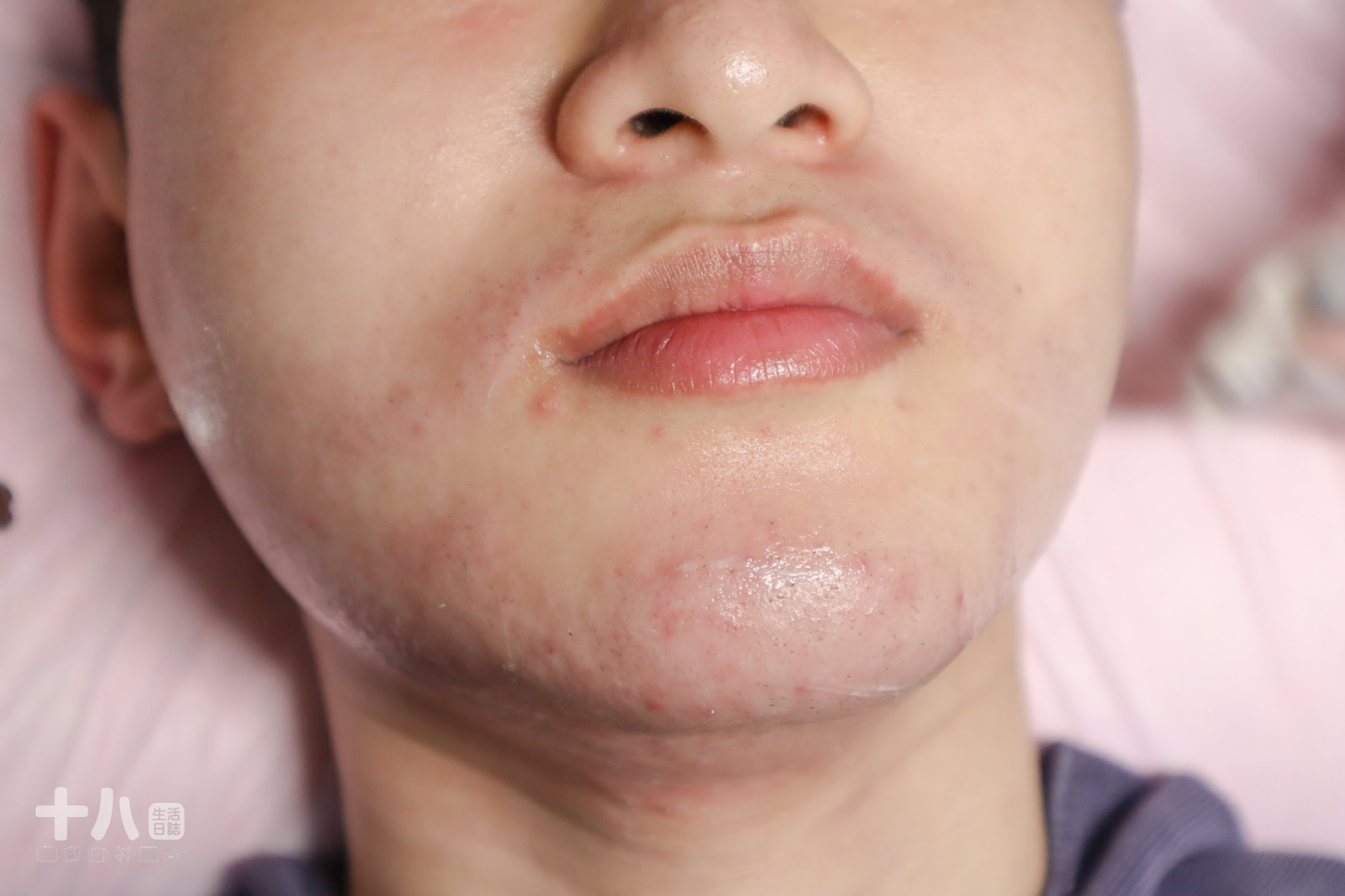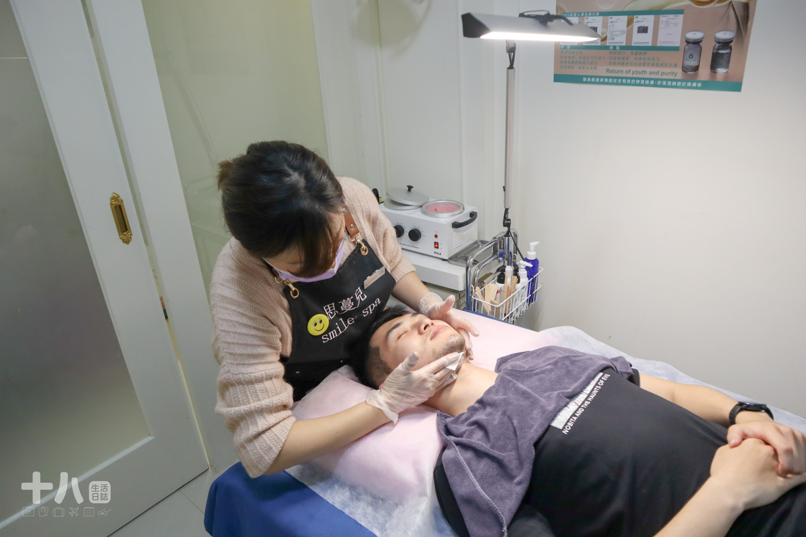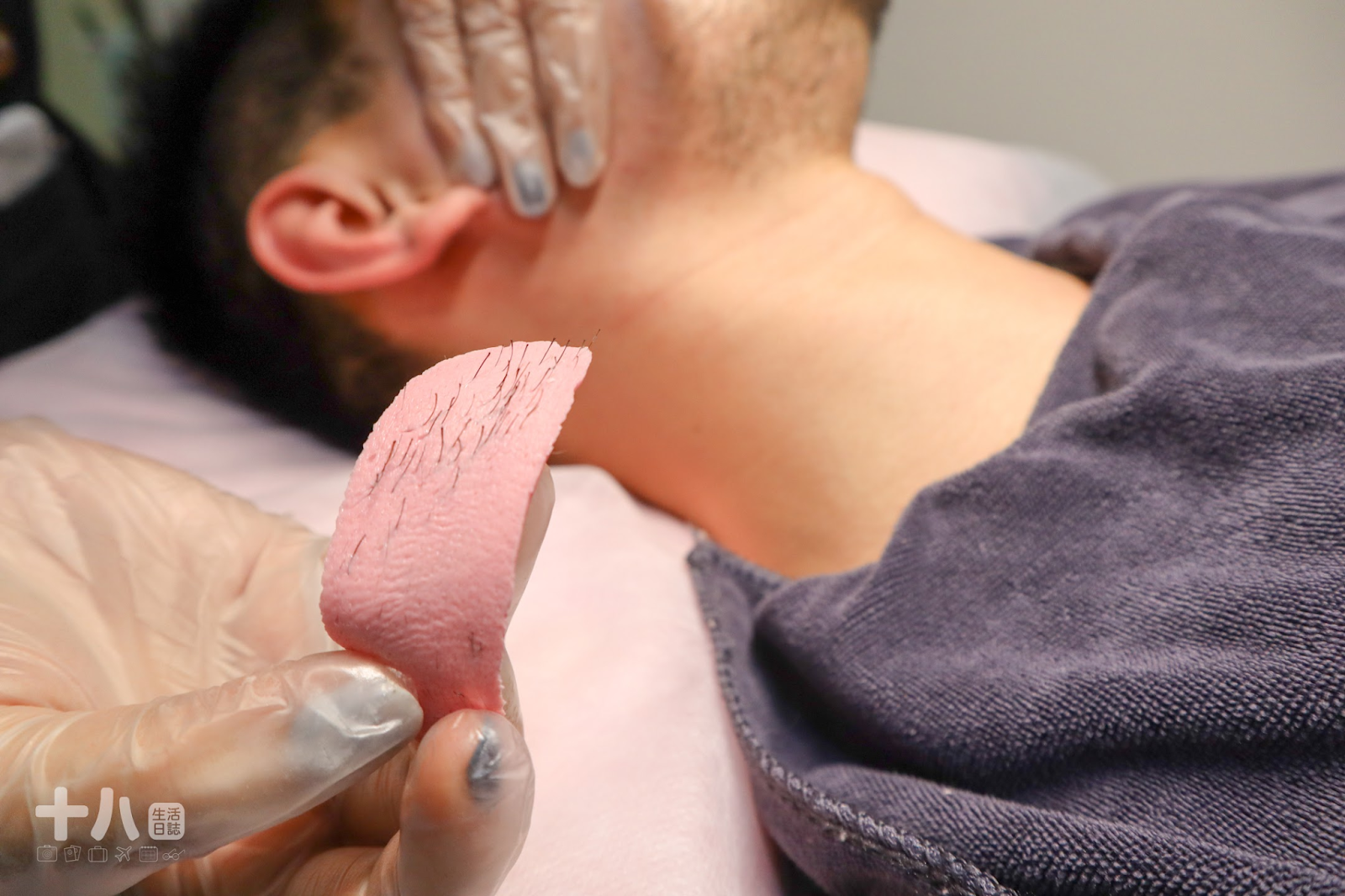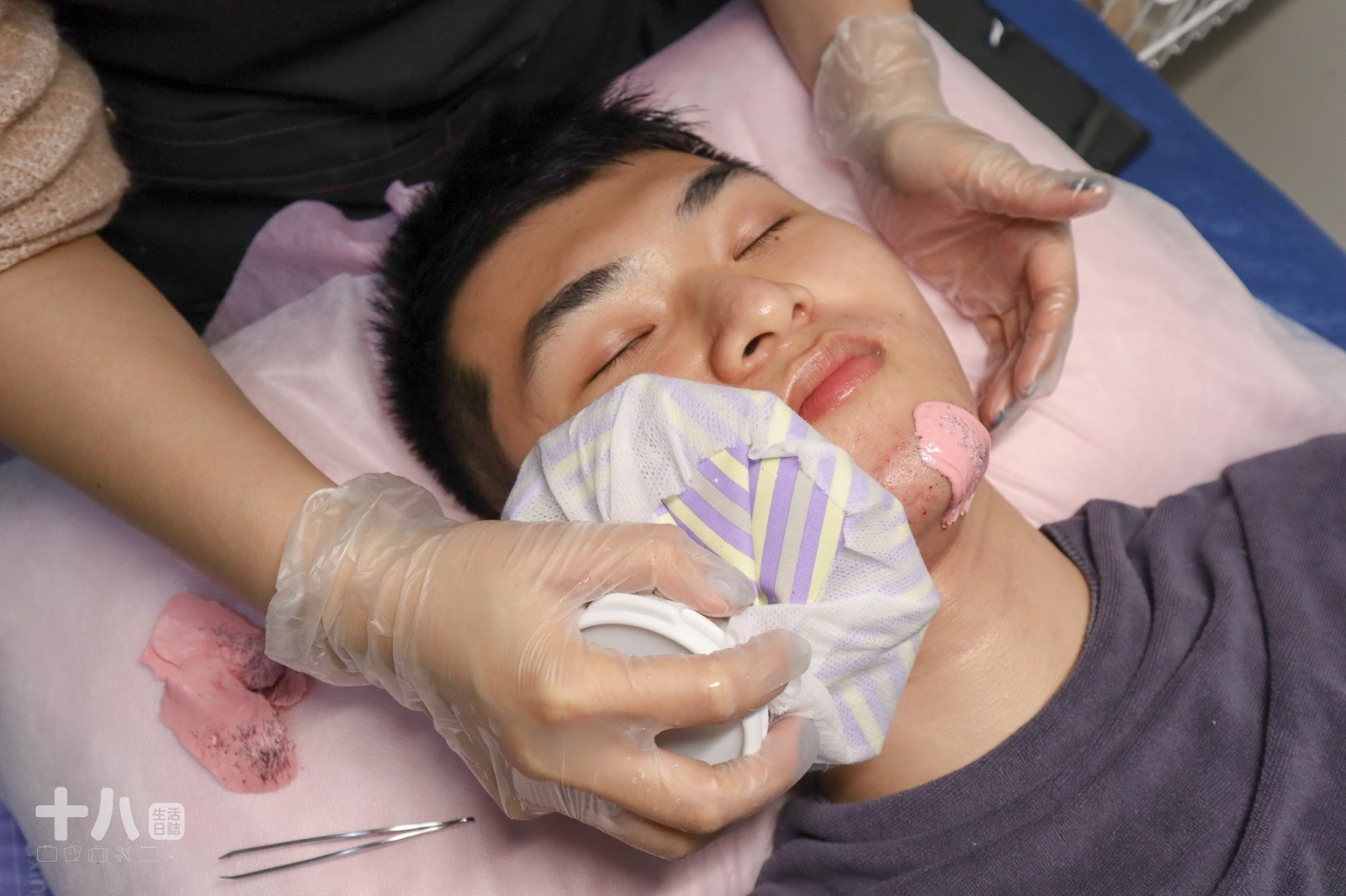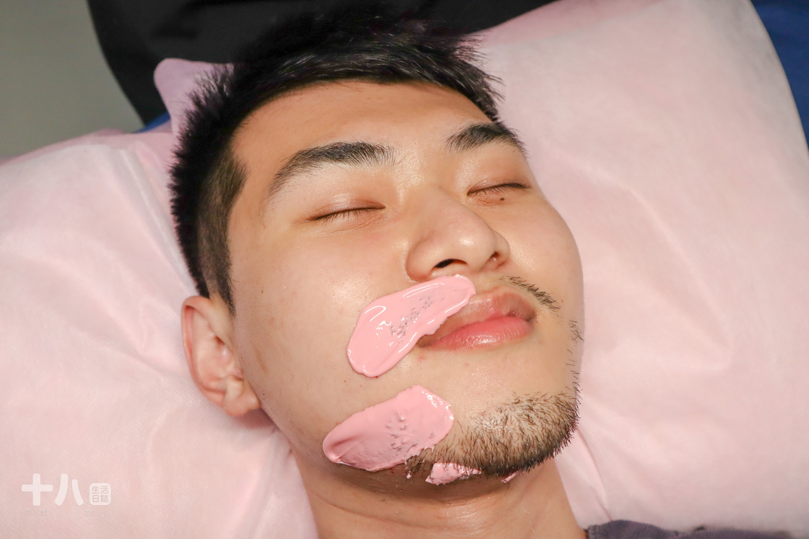 剛躺上去的Gavin一臉享受,準備將雜亂的鬍鬚一次處理好,老師說他的鬍鬚偏硬,臉部熱蠟除毛時間約40分,那為什麼要熱蠟除毛呢?男生刮鬍子最常遇到的狀況,就是刮鬍子使用不當,讓肌膚發炎紅腫、或是刮鬍刀不當,容易刮傷破相,熱蠟讓毛髮生長速度變慢、毛髮變細。