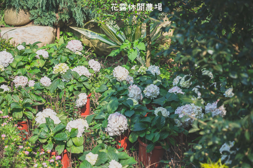 如果你們有仔細看,在入口處一進來就會看到隱藏在這些花草裡面的白色繡球花,繡球花季大約落在每年的4~6月前後,而今年的第一波繡球花就在花露農場。
