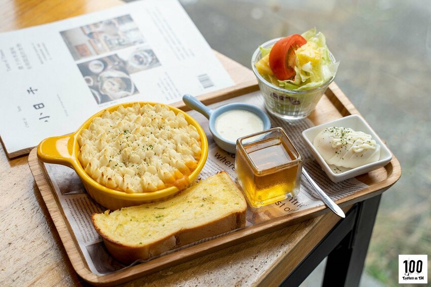 底層鋪上自製手工肉醬,把牛絞肉換成大眾接受度較高的美濃黑豬肉,並佐以一層厚厚的馬鈴薯泥提升風味。每日限量供應,另附蔬果沙拉、現烤吐司、水煮蛋、茶凍和優格。