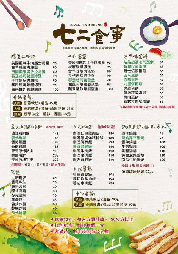 店名「七二食事」可不是空穴來風,主要是因為開店初期的營業時間落在早上 7 點到下午 2 點(07:00-14:00),於是老闆就想到用《九九乘法表》的 7 x 2 = 14 作為店名,是不是很有梗!