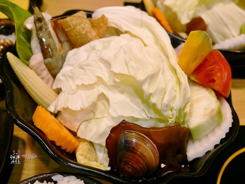 套餐都會附一個基本的菜盤,現在的火鍋店都走比較健康的路線,大多都是青菜或是加一兩隻小蝦子、蛤蠣,比較少放火鍋料了,這邊也不例外,但是他們的附餐蛤蠣會不會太大一顆?