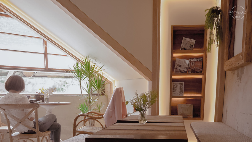 加上那個位置有點像小閣樓又有點像樓梯下的小角落處,利用木框將頭上的白牆連地加上木製框設計,窗戶也用木色設計,讓這一區有一種清琳咖啡獨享的「公主下午茶」的情境。