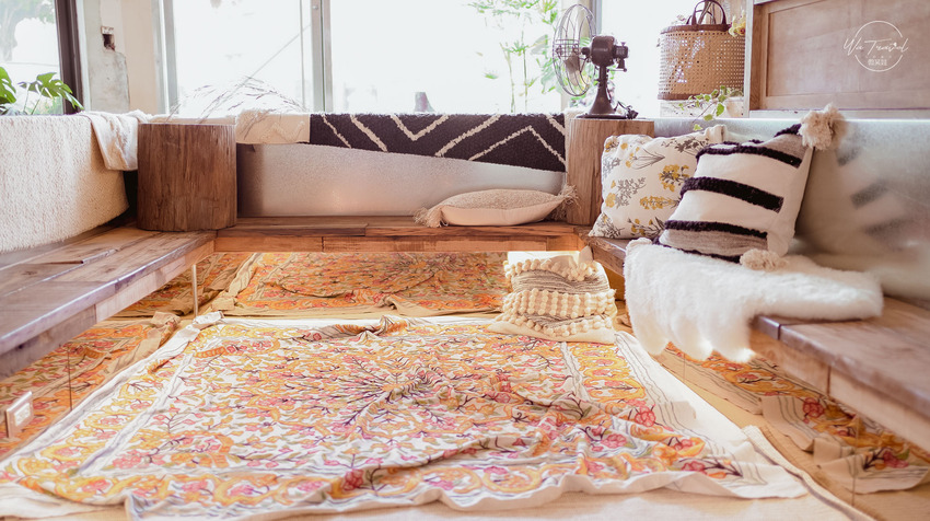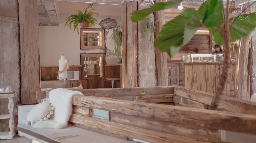 ▲ 原木的店家設計,清琳咖啡用材質較帶柔感又繽紛同色系的地墊襯托出整個區域的契合感。
