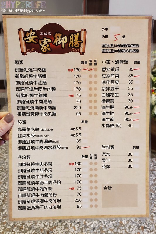 緊接著來看一下安家御膳的菜單,有牛肉麵、冬粉、水餃等北方料理,主要的口味都是以紅燒為主,店家也可以針對家庭客中不敢吃辣的小朋友的專門做清燉口味的哦,非常貼心