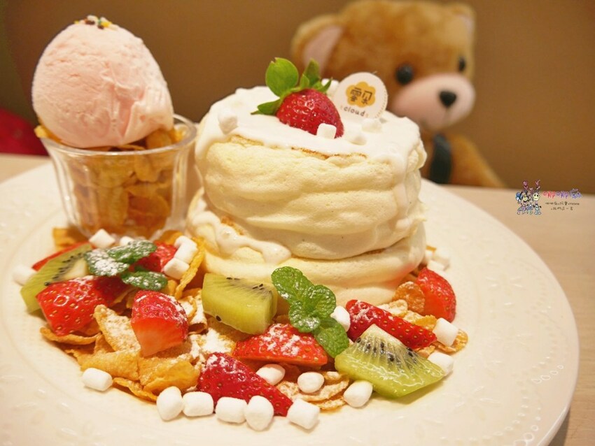 疊起來的兩個舒芙蕾蛋糕上面淋上奶油還有半顆草莓,旁邊鋪了玉米脆片當底上面在擺上奇異果和草莓,另外還有一杯玉米脆片和草莓冰淇淋的結合,最邪惡的是還附了煉乳搭配草莓,一整個讓人拋棄熱量先吃再說。