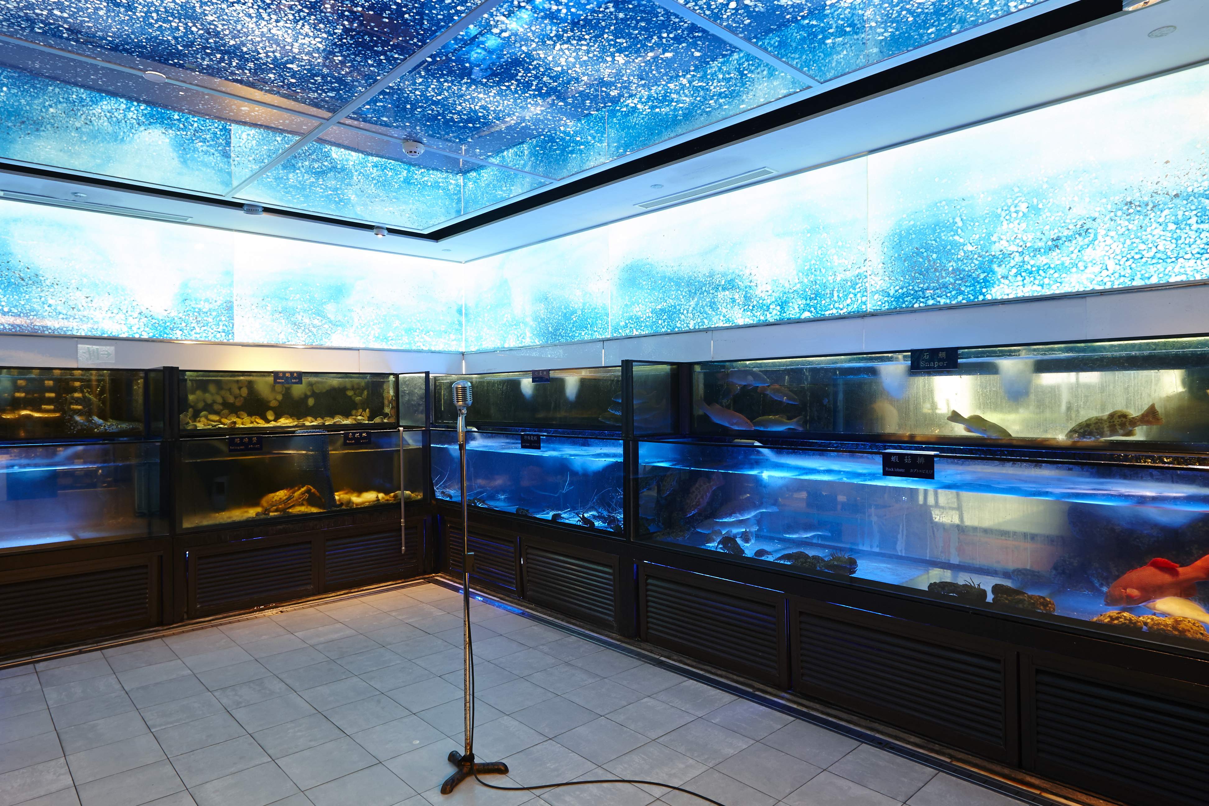 走進真的好的生猛海鮮區,宛如置身於湛藍的水族館一般,這也成為台北餐飲界首屈一指的亮點!眾多產地直送與國外進口的生鮮魚貨,如蘇眉、老鼠斑、七星斑、石頭魚、巨型龍膽魚、鱈場蟹、花蟹、龍蝦、牡丹蝦、瀨尿蝦、象拔,種類多得目不暇給。