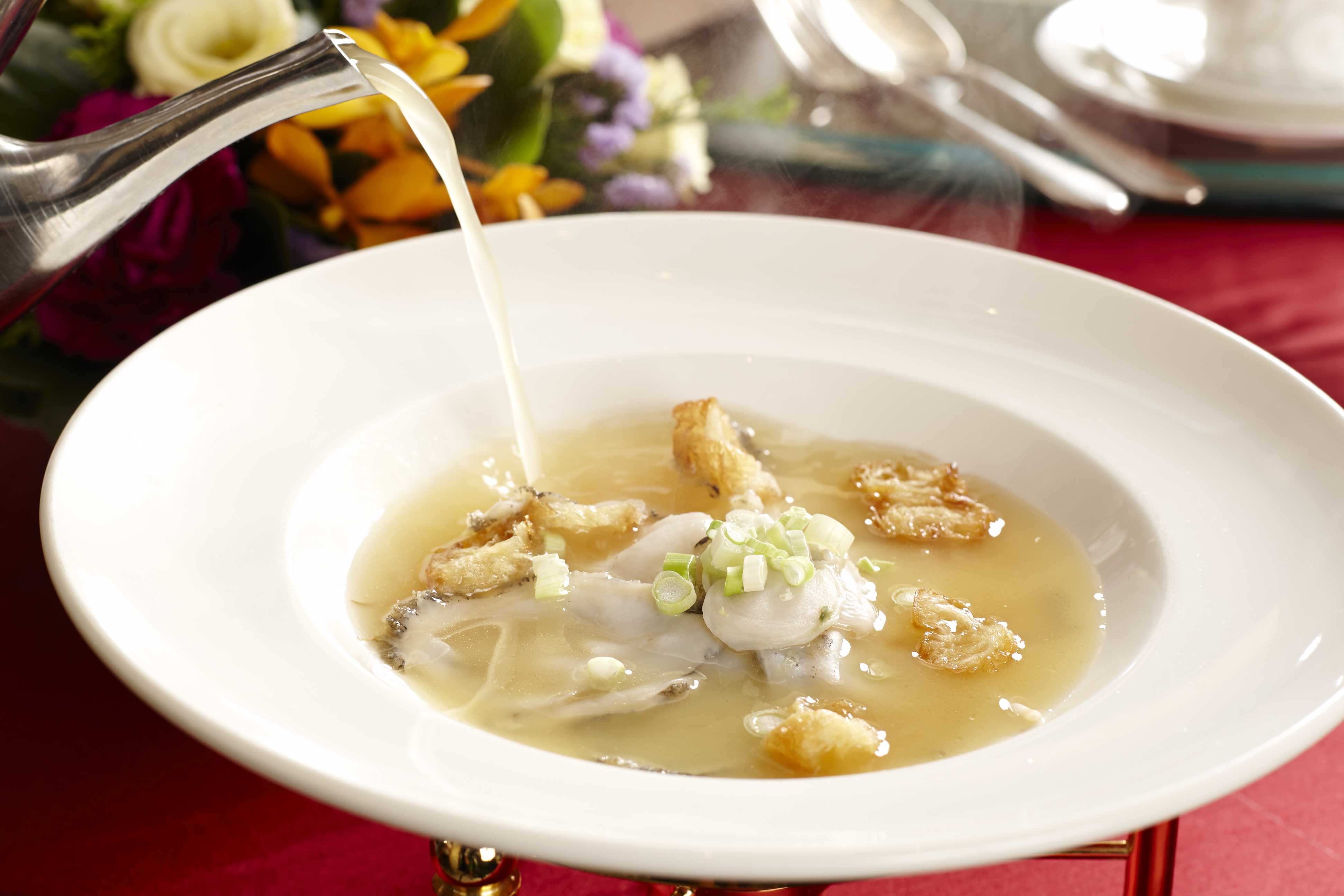 來自澳洲個頭適中的新鮮活鮑魚與響螺雞高湯的雙響絕妙組合極味湯品。整顆新鮮活鮑魚洗淨川燙後,將之以刀工片薄,均勻擺盤於湯盤中。