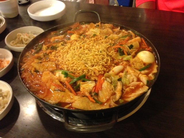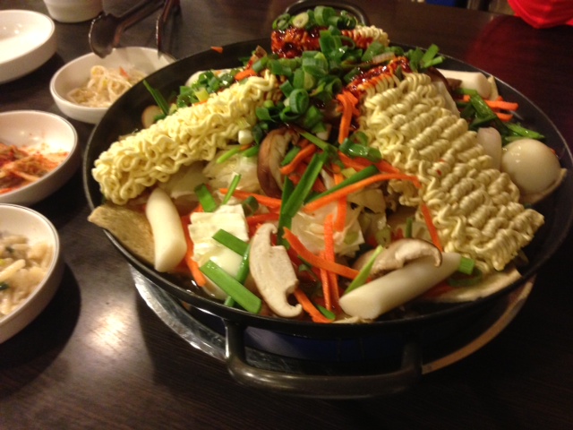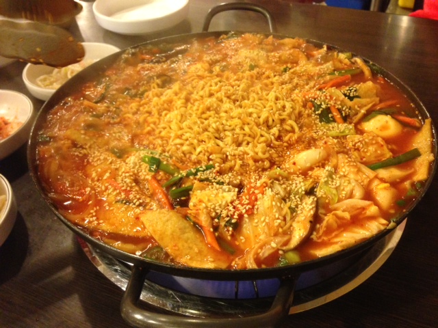 來看看正宗韓國辣炒年糕,像個臉盆裝滿年糕(後來吃下去發現是聚寶盆),我們還學隔壁桌的韓國人加點了起司、小香腸、甜不辣、馬鈴薯、冬粉全都丟進去!(根本吃不完啊!韓國人到底是怎麼吃一大盆又很瘦的啊!!!)