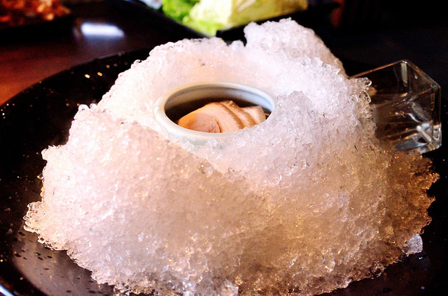 只留下肉中的膠質,放入白鍋中川燙的三秒,入口滿是酒香