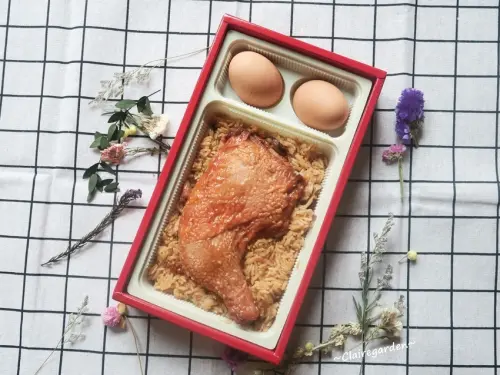 紅蛋、雞腿&油飯,油飯的配料包括阿根廷魷魚、栗子、香菇、肉絲&蝦米