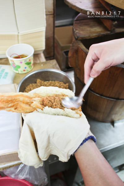 飯糰透過店員那熟練的手法將飯糰捏製的紮實,糯米本身濕潤香Q,餡料包有肉鬆、油條還有一匙白砂糖。店家說因為在以前顧客多為勞動量較大的工人居多,為了讓工人們吃得飽且熱量足夠因此多加了砂糖。