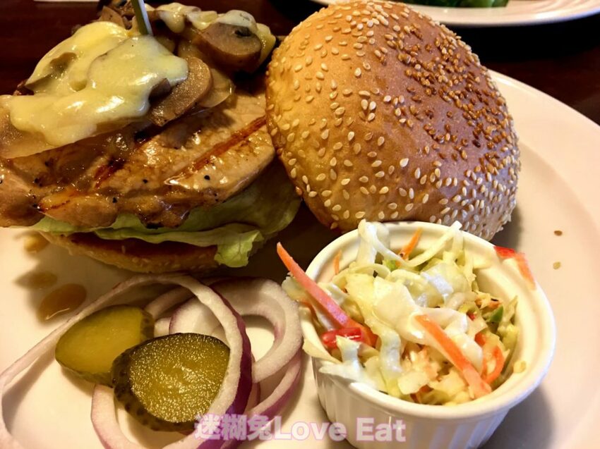 🔺豬排部分口感十分厚實而且充滿炭烤香氣,搭配上面天然原味的蘑菇起司醬與生鮮蔬菜,一整個分量十足,風味是既天然又好吃