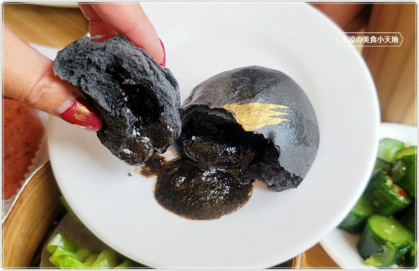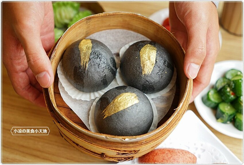 黑金流沙包,黑色的外皮以竹炭粉下去製作,入嘴會帶著淡淡的竹炭香,加上金箔一筆,更提升視覺效益!