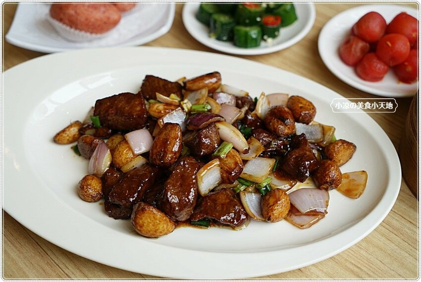 以整顆蒜頭、洋蔥、蔥末大火快炒骰子牛,看似油亮動人,吃起來不油膩喔!!!