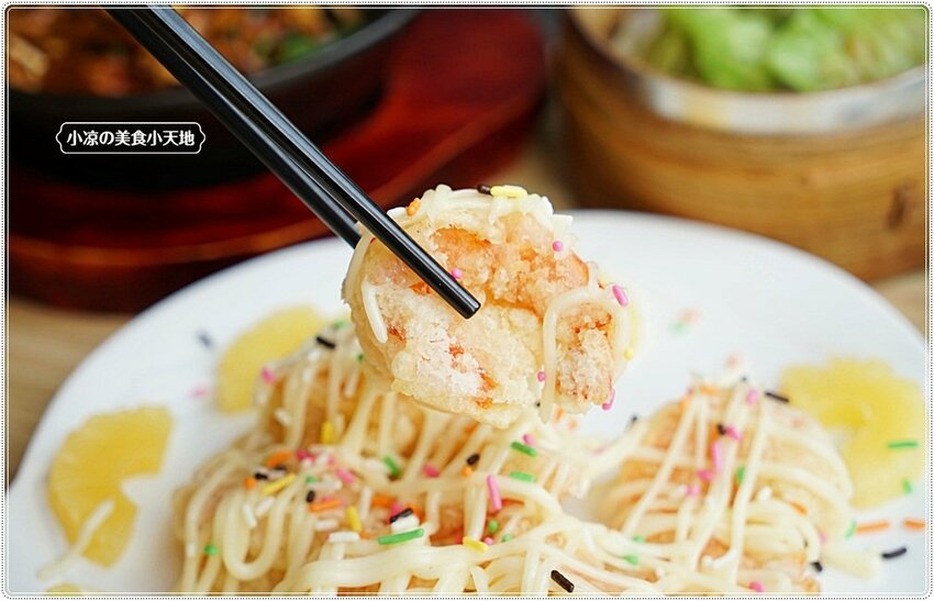 草蝦仁裹上薄粉油炸,再淋上美乃滋等,入嘴帶了甜香、外層微酥蝦肉Q彈,再來一塊甜美的鳳梨片,完美!!