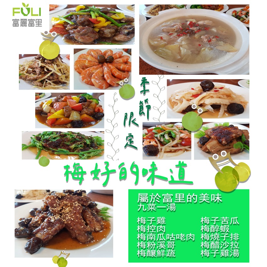 親手採完梅子後,還可以使用玻璃罐,學習自己醃製青梅。都來到富里了,總不能一直望梅止渴,當然要坐下來好好品嘗一番,這時就可以前往羅山農特產展售中心二樓餐廳,品嘗大廚幫你備好的『梅好味道』農食料理啦!若想要品嘗這滿滿季節限定的梅子桌菜,去前記得先打電話03-8821705預定唷!(定價:九菜一湯5000元)