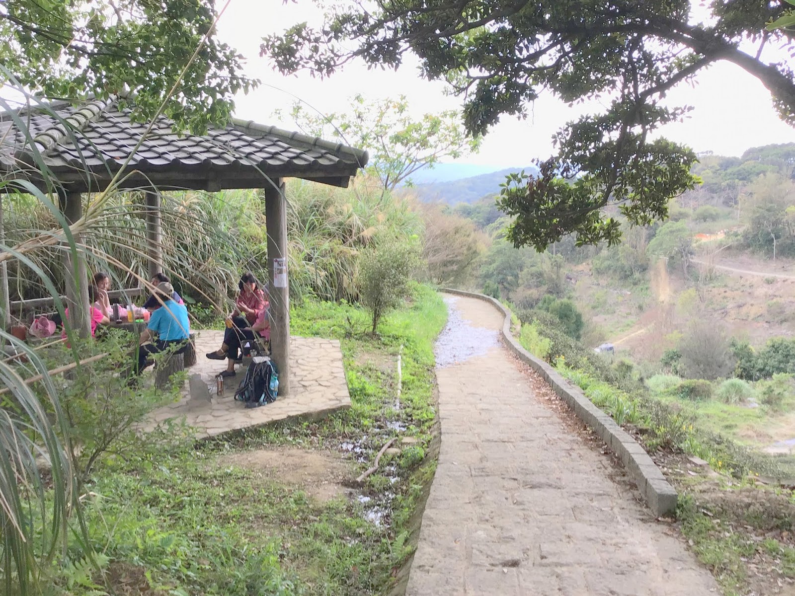 石板小徑、池塘、涼亭,藍天白雲風和日麗,悠閒走在