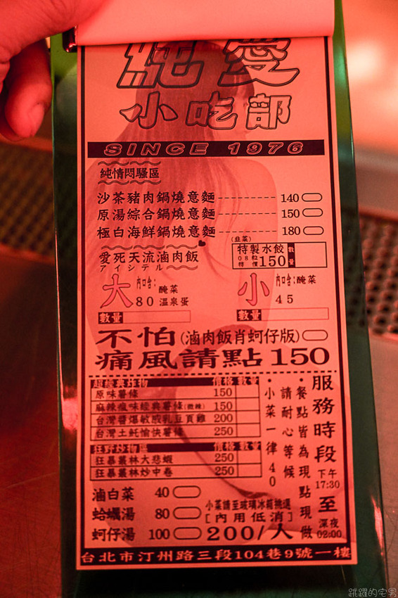 黑漆漆的外表 粉粉暗紅色的燈光,走進去彷彿穿越時空來到台灣80年代小吃部一樣,而且我去查他的粉絲團,連鄭家純-雞排妹都來這裡拍照過ㄟ我看到就一直整個腦洞大開XD 我覺得這裡很有茄子蛋他浪子回頭或是其他歌中的場景模樣,純愛小吃的名字也讓我想起玖壹壹的癡情男子漢這首歌,他位置就在鷹流東京豚骨拉麵-極匠旁邊,而且這裡提供蚵仔滷肉飯、沙茶鍋燒意麵等很台灣的食物, 當然不只賣吃的 也有提供調酒等飲品,這間在台大附近美食很值得來拍照ㄟ, 台北IG網美餐廳就是你了!