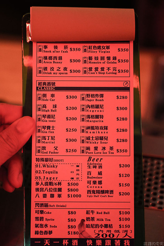 純愛小吃店菜單 他的菜單其實比我想的豐富,菜單很台灣味,滷肉飯、鳳梨苦瓜雞、鍋燒意麵跟一些炸物 當然還有啤酒跟調酒這些,調酒名字也太厲害了吧 請給我多人混戰跟事後菸XD 然後低消一個人是200元