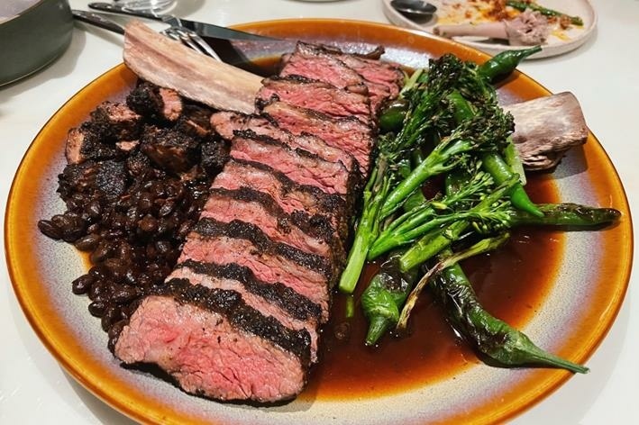 菜單上最昂貴的一道餐點,14OZ的帶骨牛小排分量十足,四個大男生分享也是綽綽有餘.紹興酒煨煮過的牛小排本身已帶著紹興的香氣,粉紅色的牛肉軟嫩誘人,這麼西式的牛小排居然搭配上水豆鼓!服務生說這是黑椒牛仔骨和鼓汁排骨的變化版.小小塊的牛肉外面有粗粗的黑胡椒粒.十分入味的豆鼓有一種特殊的香氣,單吃當然有點鹹,但搭配牛小排也一點都不違和.