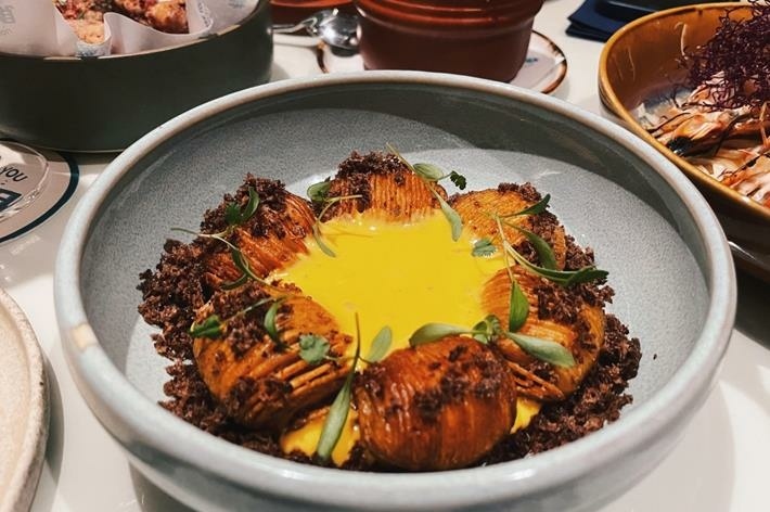 潭子出產的小馬鈴薯鬆軟中帶點Q彈,切成薄片,搭配海膽起司醬,用臘肉取代常用的培根脆片.很難界定這是西菜中吃或是單純西菜.但我自己有馬鈴薯跟起司就給過.再不能單點白飯的菜單中,馬鈴薯也是另一個飽足的存在.