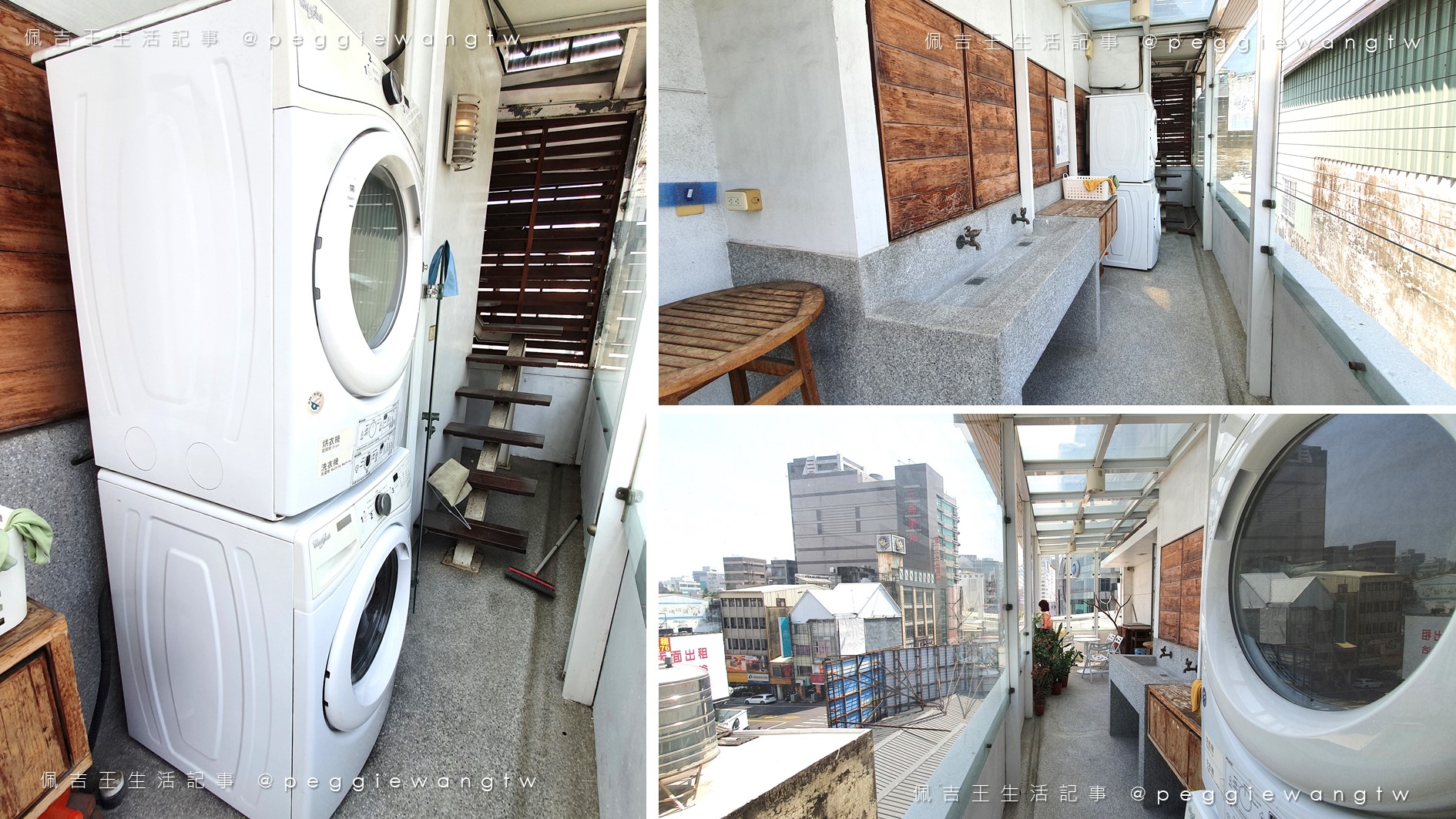 這裡提供洗衣機和手洗台,洗衣服空檔時間,旁邊桌椅可讓你發呆、休憩。