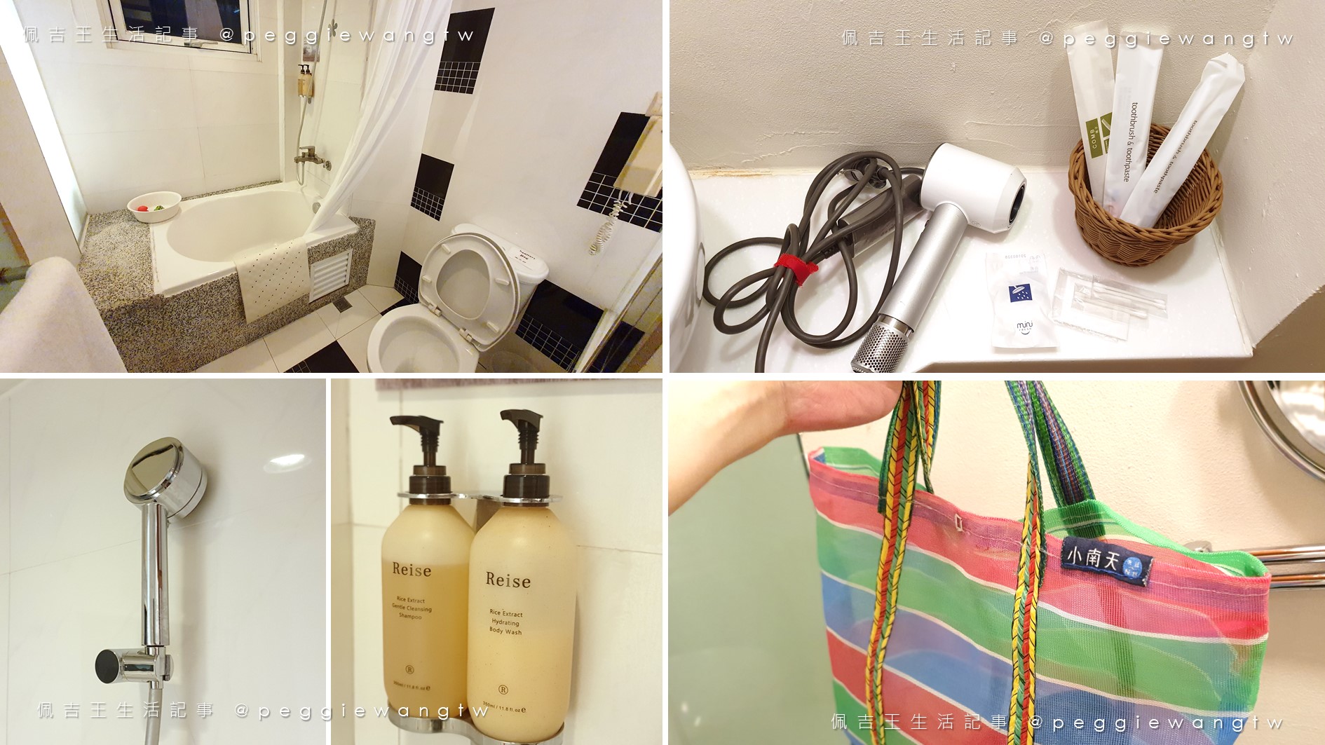 除了Dyson吹風機,還包含台灣天然有機品牌-米膚的沐浴乳、洗髮乳、乳液 ,備品則有牙膏&刷、浴帽、棉花棒,大浴巾、中毛巾,皮拖鞋。