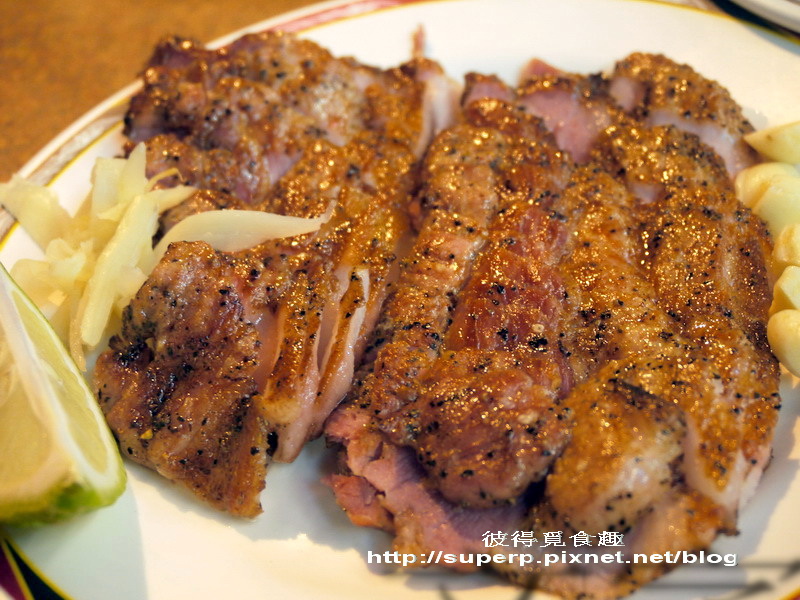 烤豬心$250(正以為已經上完菜時,又上了這個網路上很多人推薦的烤豬心。這豬心烤到外脆內嫩有彈性,擠上一些檸檬汁,的確是絕品,大推!可惜這時大家已經真的吃不太下)