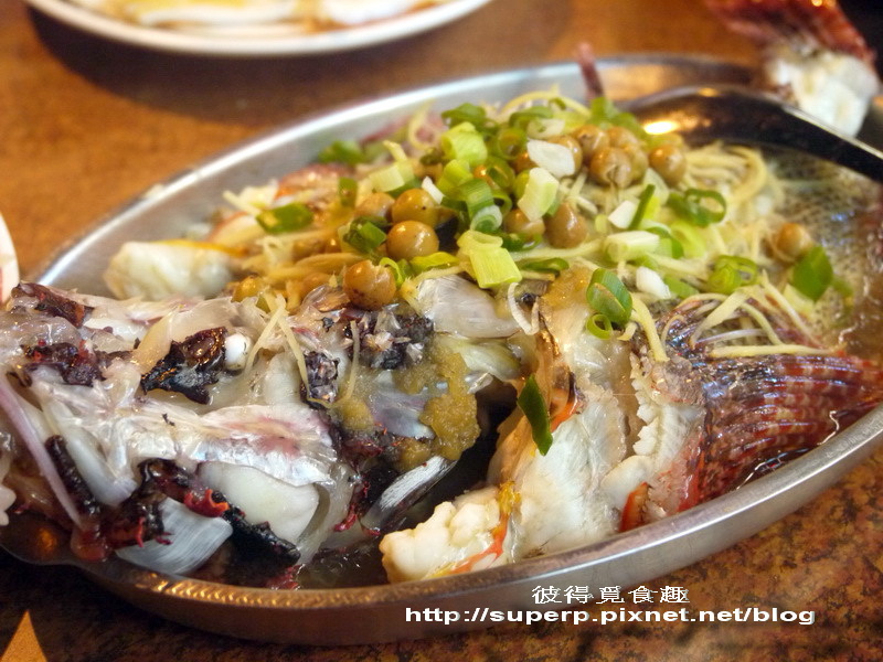 蒸石狗公$970(跟破布子一起蒸熟,味道有入,而且嫩度跟彈性均佳,不會像一般喜酒吃到糜爛的口感,非常大一條,肉多。不過這時候我們已經快吃不下了,還是很不錯啦)