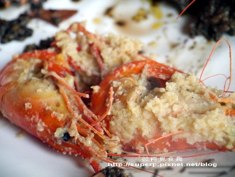 蒜泥蝦$650(太熱騰騰,冒著煙實在是不好拍。總而言之,蒜泥味道很重,不過不會嗆,我很喜歡。蝦子也極為肥碩,裡面滿滿的蝦腦,令人想冒著得痛風中風的危險全嗑掉!大推!)