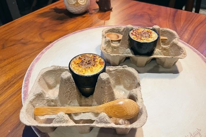 放在蛋型容器再置於蛋盒中的擺盤真的很有創意.以鴨肝醬,牛奶,和蛋液做成的烤布雷,沒有鴨肝味,又不似烤布雷滑順也不像日式蒸蛋鮮美外型遠勝於口味..