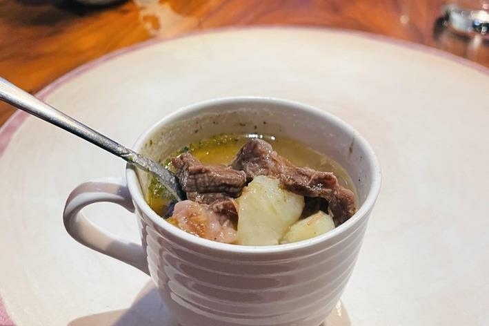 說是洋蔥湯其實還加上好多牛肉跟馬鈴薯一起燉煮,飽足感十足,幸好只是一小杯,喝起來不太像一般的洋蔥湯反倒像是吃完火雞將骨架丟下去煮的turkey leftover.