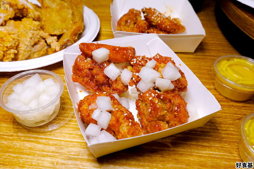 店內的韓式雞翅是選用三節翅,會剪成腿跟二節翅兩部分,並且會刷上一層店內自製的韓式辣醬,甜甜辣辣的程度會比泰式辣醬再辣一些。