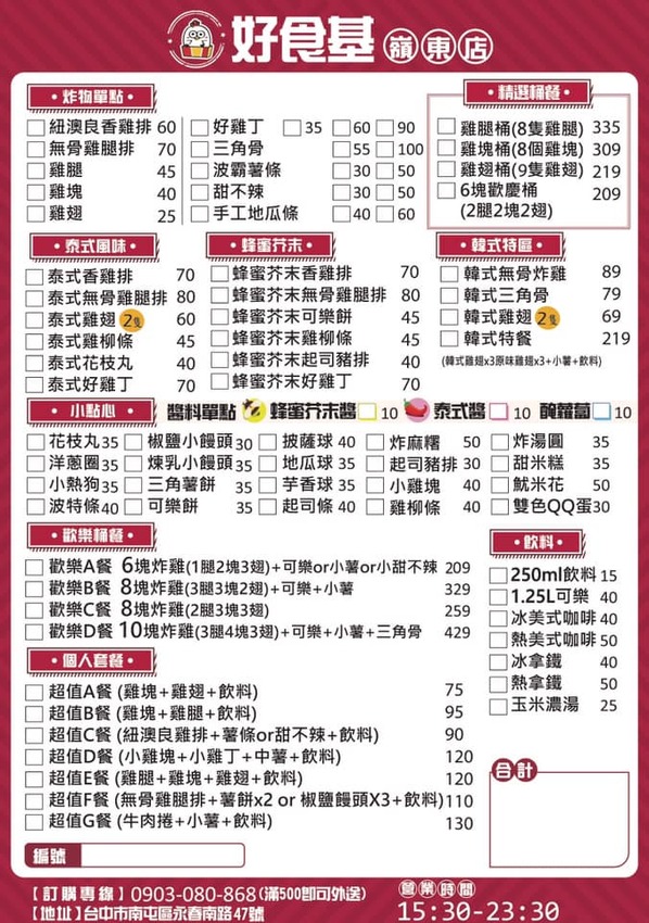 「好食基美式炸雞」在美式炸雞、美式雞排中加入自製的特調醬成為一個很大的特色,也讓美式炸雞不是千篇一律都很雷同,多人聚餐或是生日聚會很適合點歡樂桶餐一起分享著吃,一個人嘴饞時也可以來一份蜂蜜芥末雞排、泰式酸辣雞排、韓式無骨炸雞或是煉乳小饅頭,這天的下午茶宵夜有滿滿的小確幸~