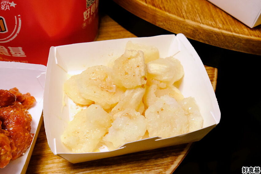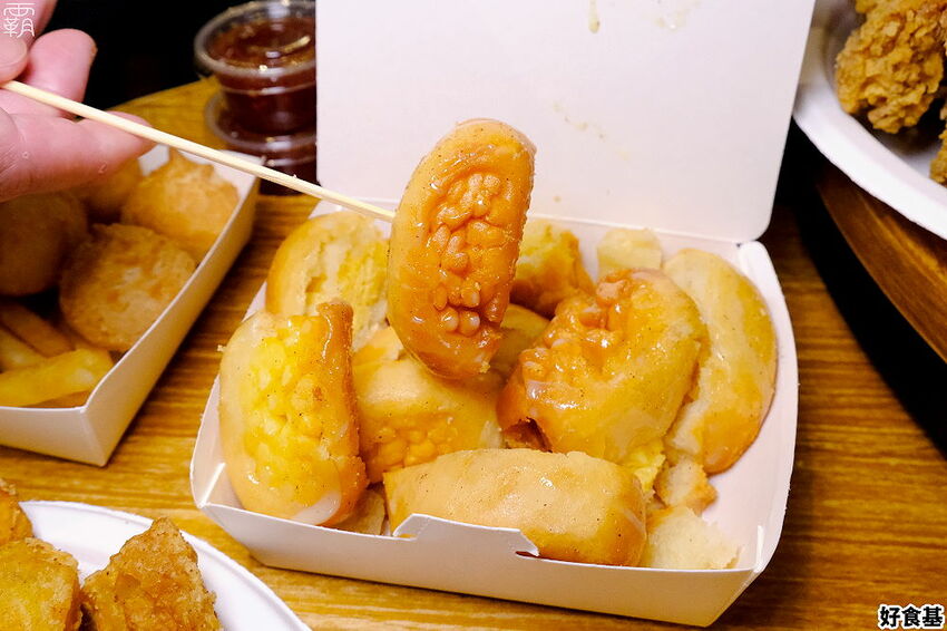 不只美式炸雞、醬料香雞排好吃,其他小點心的部分也很用心挑選,像這個日式炸麻糬,炸過後再去撒點花生粉提味,並且淋上些許的煉乳。