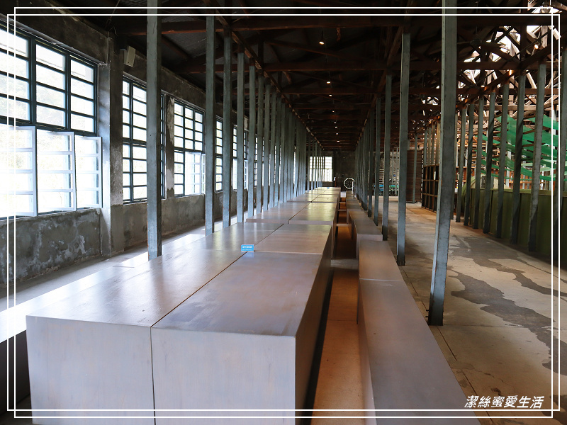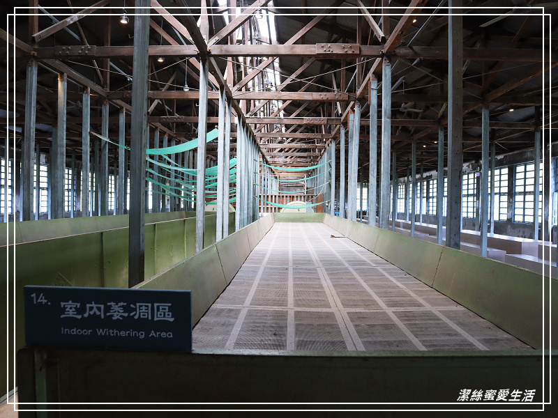 進入二樓室內,頂上縱橫交錯的的衍架,共有151根,運用力學結構,相當壯觀;下方是萎凋區,在八零年代建置了萎凋槽,將茶菁放在通氣的萎凋槽內,再引入一樓乾燥機傳送上來的熱風行萎凋。