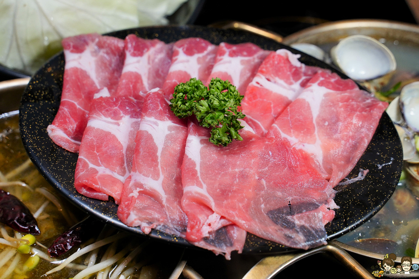 牛五花、豬五花、豬梅花、雞腿肉、櫻桃鴨、板腱牛、菜盤、火鍋料、新鮮蛤蠣