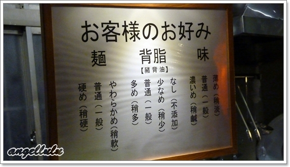 入座後會問拉麵湯頭的濃鹹度、麵條硬度跟要不要加豬背油!