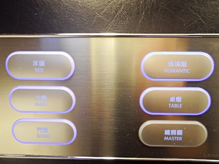 床旁邊有很特別的燈開關設計,簡約且有時尚感,就算整個房間燈都關了,這些按鈕還是會發出藍光。