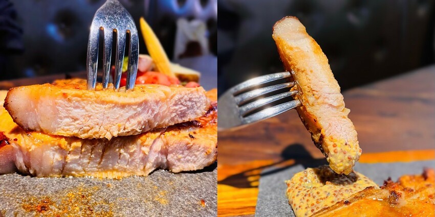 ▼豬排厚度十足口感充滿咬勁,可惜的是肉質分布油花略多偏油,不過沾上酸甜的法式芥末挺解膩開胃。